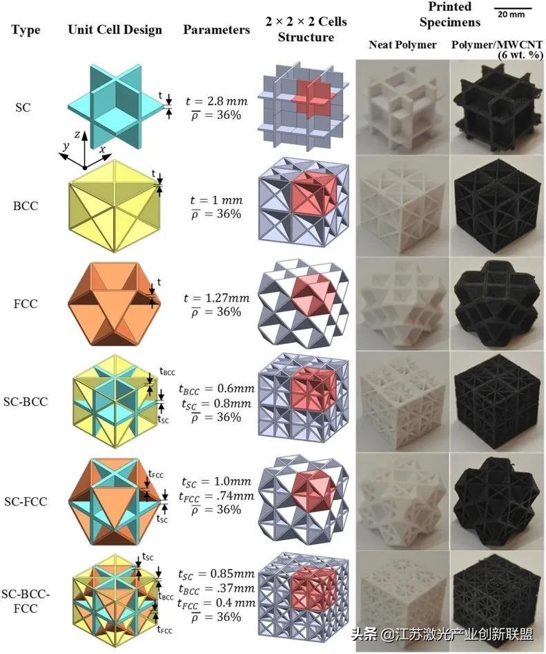 ▲图1. 各种基本和混合板状结构的晶胞设计,晶胞设计参数,CAD模型和印刷样品。所有板状晶格均具有相同的相对密度= 36%。