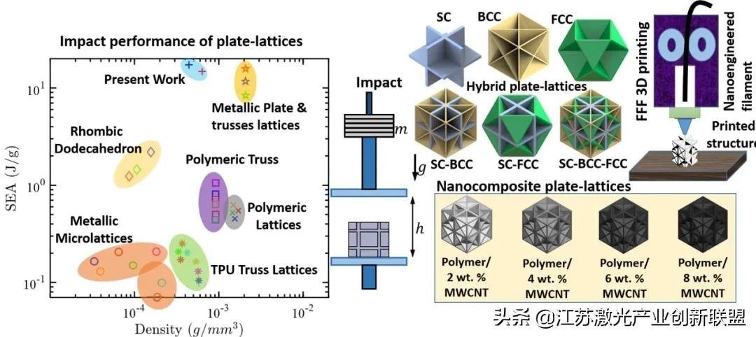 来自英国格拉斯哥大学 、阿拉伯联合酋长国哈利法科学技术大学 和美国德克萨斯A&M大学 的研究人员通过纳米工程化的灯丝开发和熔融灯丝制造,将多壁碳纳米管 (multi-walled carbon nanotubes, MWCNTs) 纳入3D板状晶格中,以增强能量吸收特性并拓宽聚丙烯 (polypropylene, PP) 和高密度聚乙烯 (high-density polyethylene, HDPE) 复合材料的应用范围。那研究人员开发的塑料-纳米管复合材料制造的新型板格设计是否可以晶体结构超材料具有更高的刚度、强度和韧性呢?